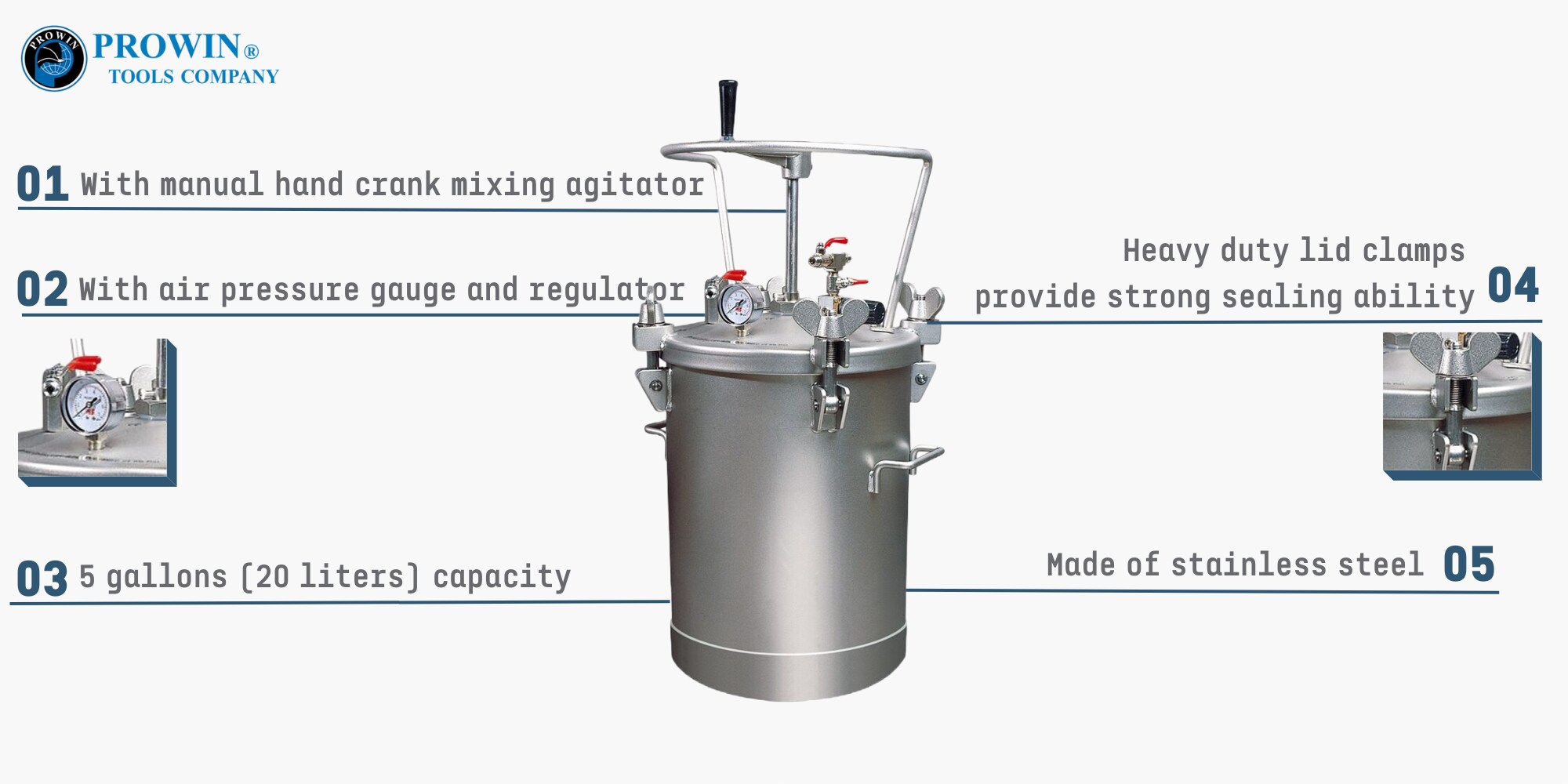 Prowin's PTS-20MH high performance pressure pot tank is designed to allow you to work over large spraying jobs with consistent portable pressure. The heavy duty paint pressure pot tank with 5 gallons (20 liters) capacity is excellent for commercial painting situations. Includes a pressure gauge and regulator and designed to work with a broad range of coatings from automotive paint, to latex and more. Equipped with a manual hand crank mixing agitator that stir the paint to avoid uneven coating precipitation.
